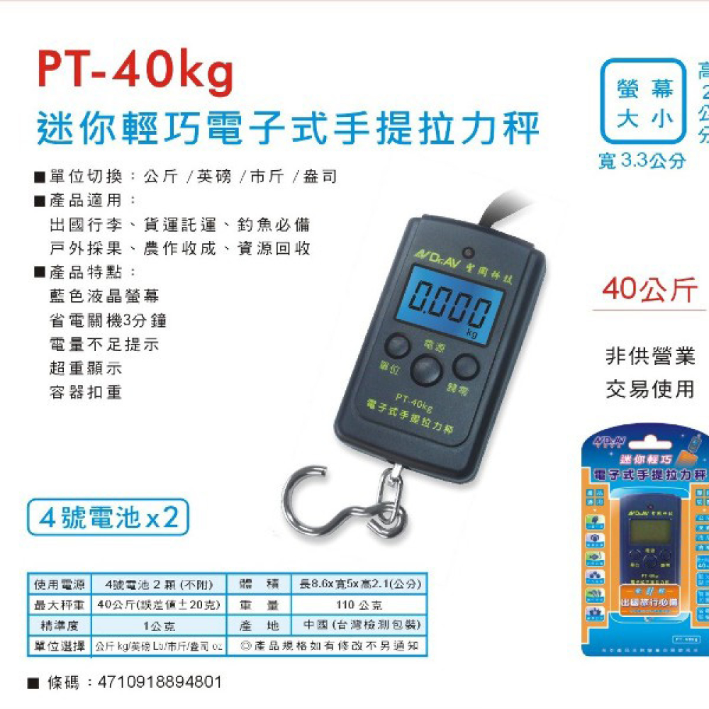 PT-40KG 電子式手提拉力電子秤 最大秤重40KG